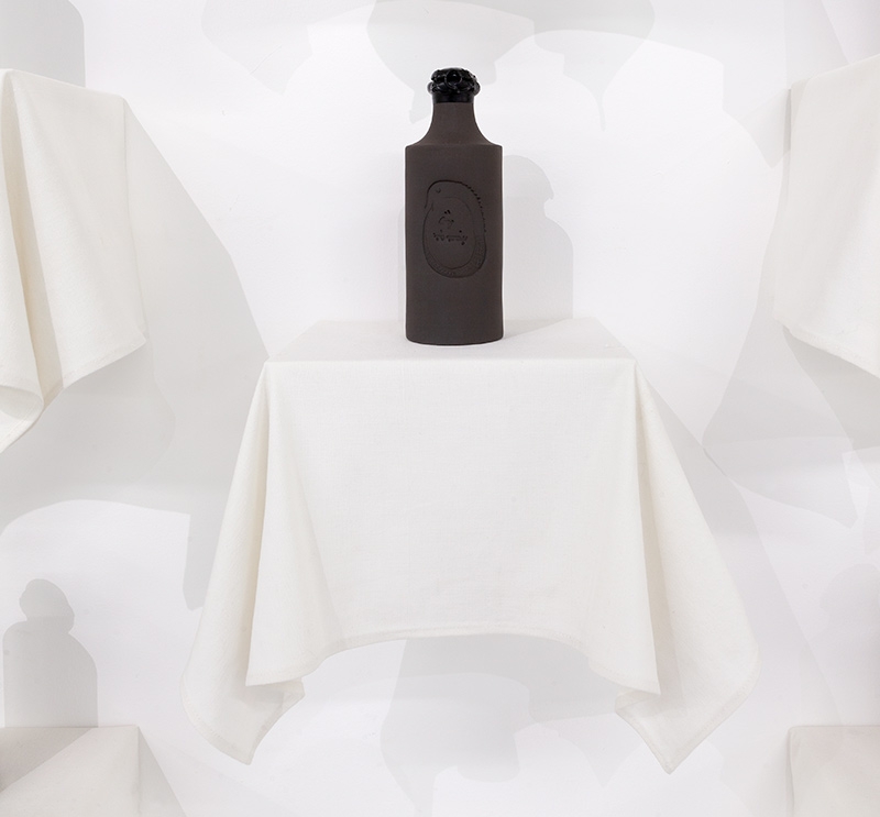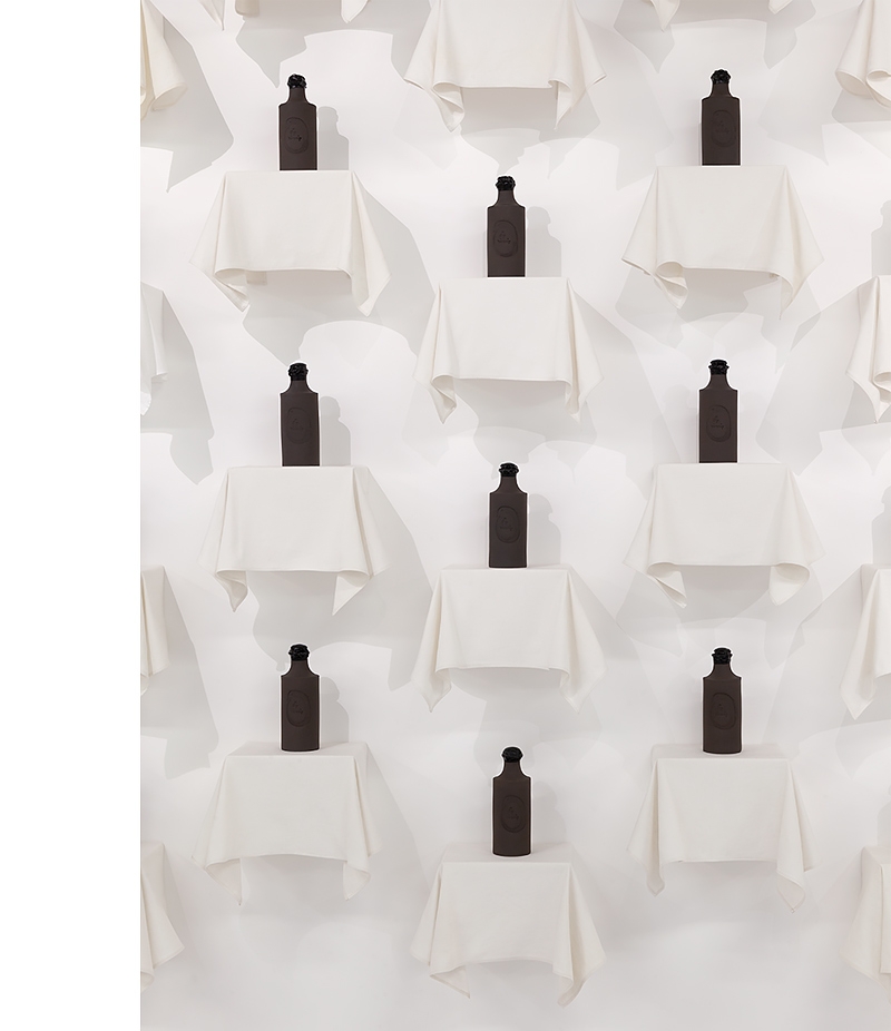 Forty black stoneware bottles are exhibited on the wall on shelves covered with cloths. Their wax-covered mouths suggest that their opening must be an intentional – and irreversible – act. Indeed, these bottles enclose a liquid – beer – whose main ingredient is anything but renewable: wheat from the 3rd century A.D. that was recovered in 1884 by Gaston Maspéro, an eminent French Egyptologist, as he excavated the necropolis of Akhmim that he had just discovered.