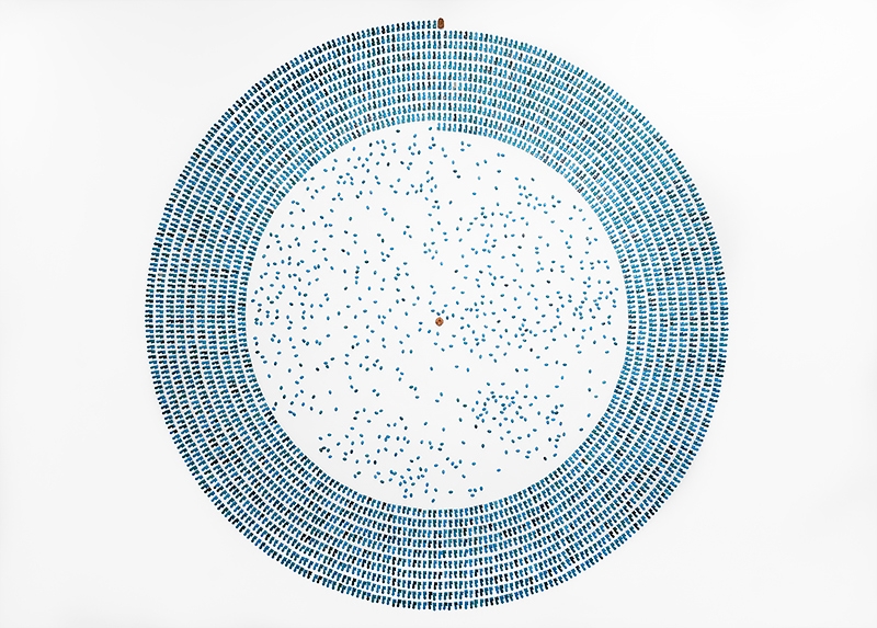 L’installation murale de 2,80m de diamètre rassemble près de 7000 pièces. Elle les réunit dans une forme solaire, contenant deux structures concentriques: une frise d’Horus s’enroule dix fois autour d’un noyau de scarabées pareils à des bactéries primordiales.