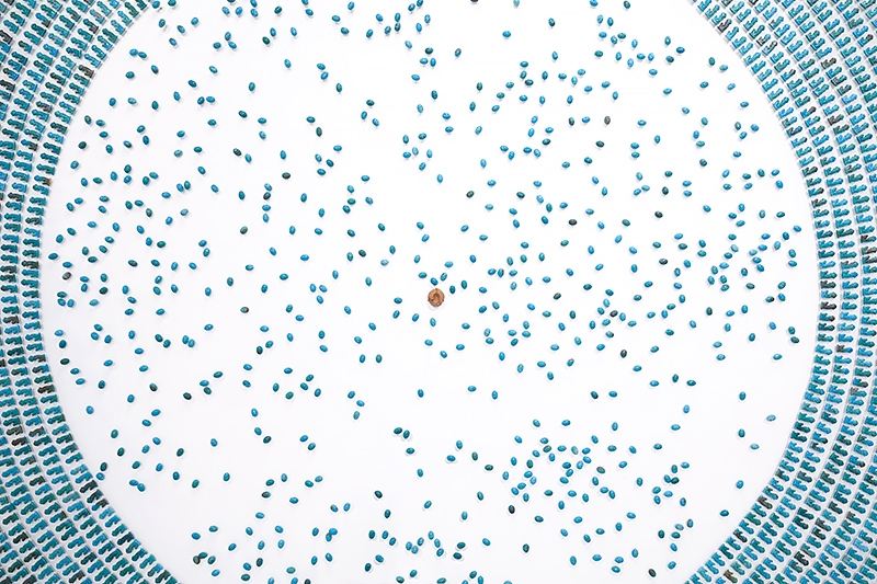 amulets (artist’s edition, self-enamelling Egyptian clay, stamped inscription ‘DEEP TIME’) 2 x 1.5 cm and 3.7 x 2 cm, installation Ø 280 cm