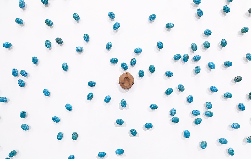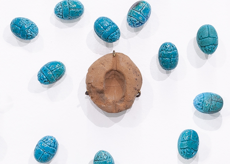 These amulets represent the sun at two moments of the day: the dawn (the scarab Khepri) and the zenith (Ra-Horakhty, Horus of the Two Horizons). This wall installation thus brings together the amulets in a solar form that contains two concentric structures: a frieze of Horus curls ten times around a core of scarabs that resemble primordial bacteria.