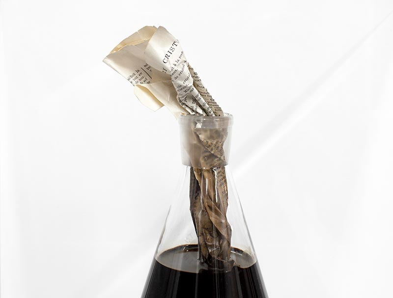 Un récipient de laboratoire (fiole Erlenmeyer) a été utilisé pour réaliser un nouveau type de cocktail molotov contenant du bitume, et dans lequel trempe en guise de mèche la page « cristallisation » d'un Larousse de 1923. Il surplombe une gerbe de cristal de roche enduite de bitume.