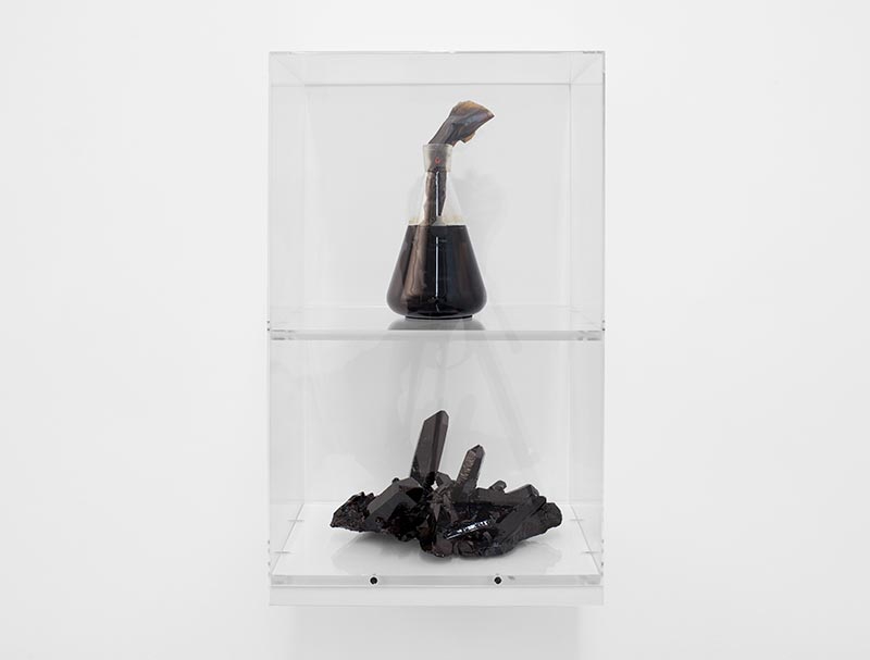 Tar-coated quartz, Erlenmeyer jar with tar and page ‘Cristallisation’ of the 1923 French Larousse dictionary, plexiglas box