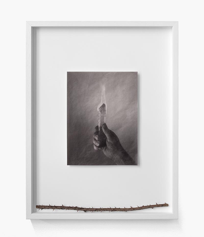 The photograph of a hand holding a flaming crystal, framed alongside thorns. The crystal is in the process of self-combustion: “What is desire but a self-burning?” asked the English poet Thomas Campion in the song