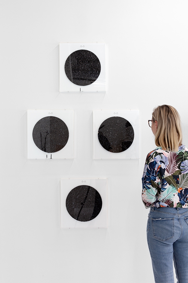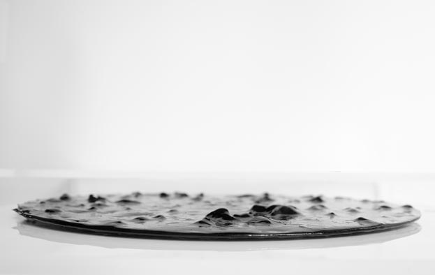 Coated with tar, these original discs become black holes or molten planets. Thanks to its properties, bitumen can perfectly preserve the music, yet preventing its immediate playback. It is a potential, silent music which emerges from this piece.