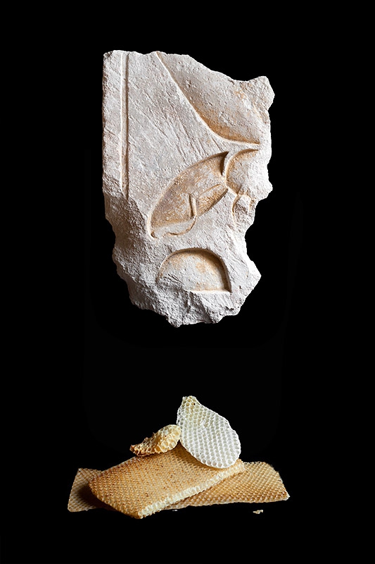 Bas-relief représentant le miel (Egypte, Nouvel Empire), rayons de cire, acier, plexiglas