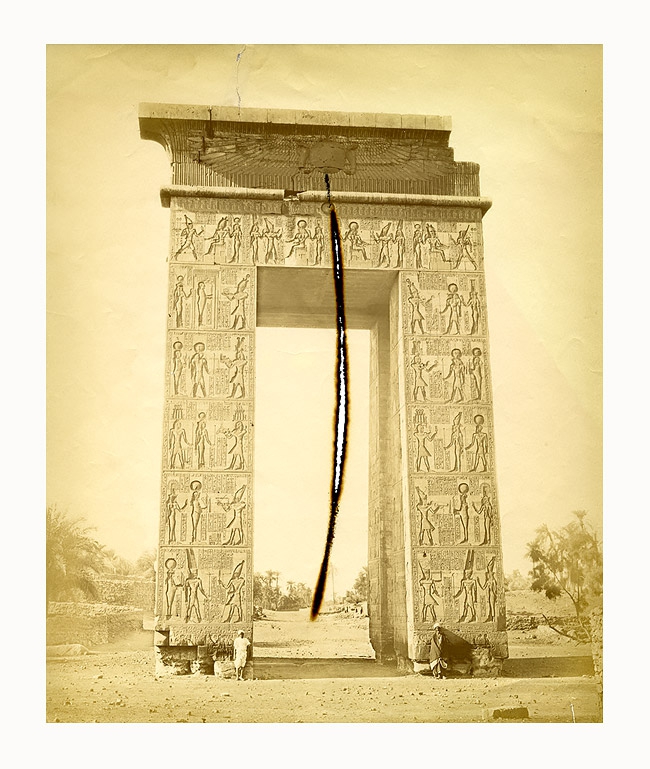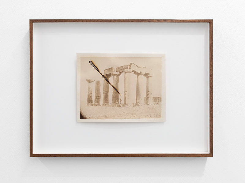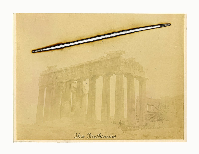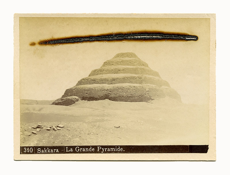 Des tirages photographiques de la fin du XIXe siècle reproduisant des vestiges antiques ou des paysages naturels sont striés d’une ligne carbonisée.