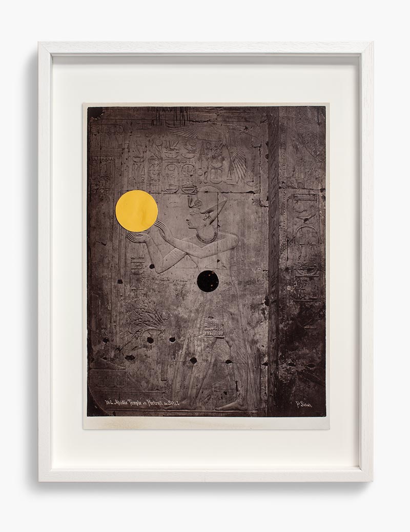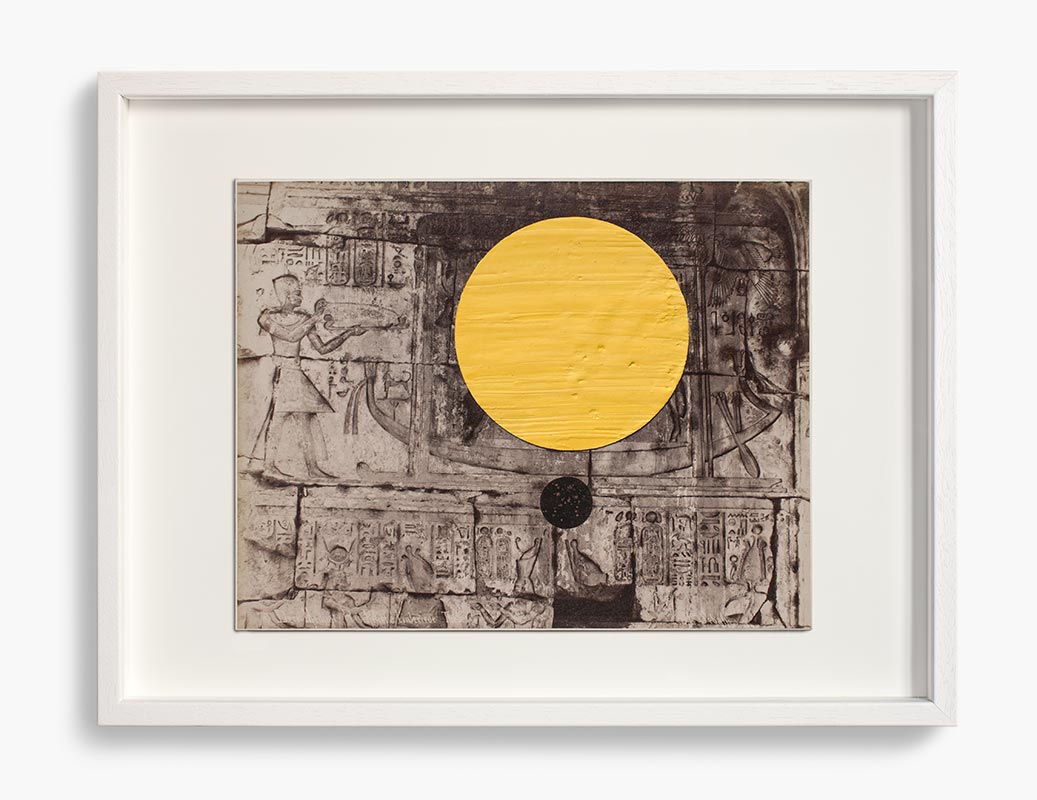 These photographs of Egypt, Greece and Italy (some of them anonymous, most of them signed) are typical of the period: archaeological sites, objects and statues from museums stand alongside genre scenes of daily life. Several layers of time are superimposed upon one another: antiquity, the moment the photo was taken, the present time. Yet what is really evoked here is a timeless present; the circles of tar and wax embody an energy both invisible and eternal, that of binary motion, rhythm and transformation, yin and yang.