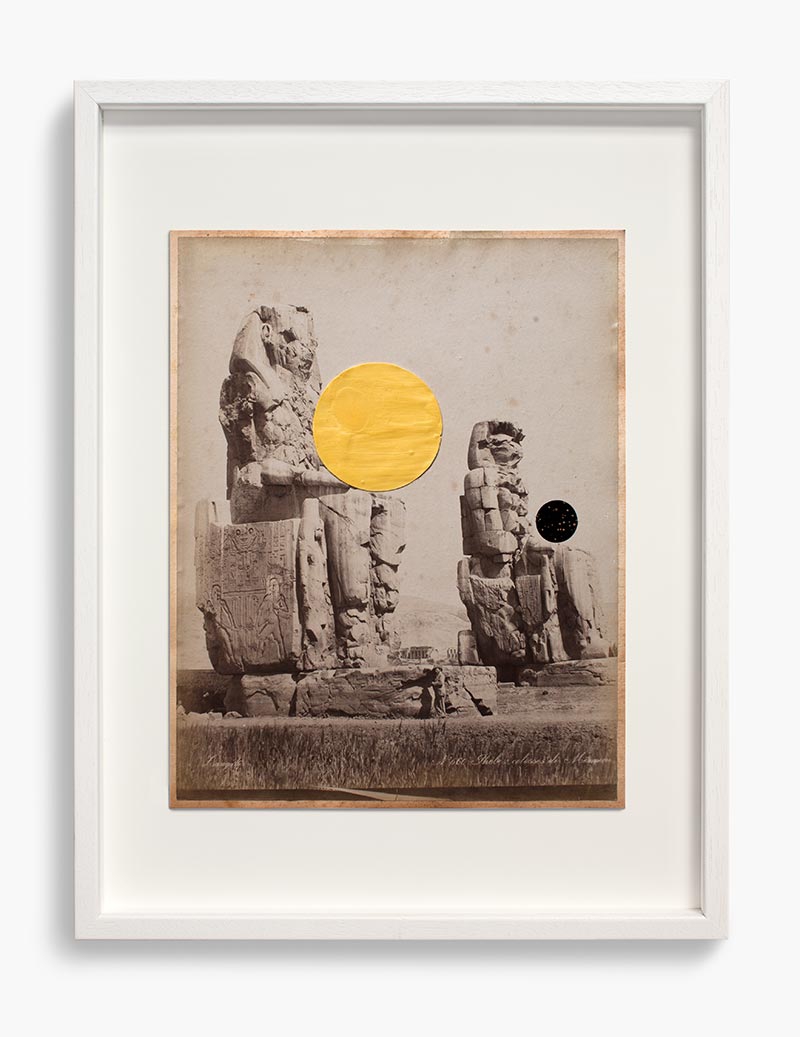Ces photographies d’Egypte, de Grèce, d’Italie (certaines anonymes, la plupart signées) sont typiques de la période: sites archéologiques, objets et statues des musées côtoient des scènes de genre de la vie quotidienne. Plusieurs temporalités se superposent: les temps antiques, le moment où la photo a été prise, et l’instant présent. Mais c’est un présent intemporel qui est ici appelé; les ronds de bitume et de cire matérialisent une énergie invisible et éternelle, celle du mouvement binaire, à la fois rythme et transformation, yin/yang.