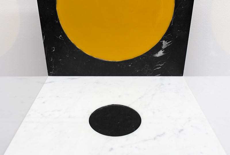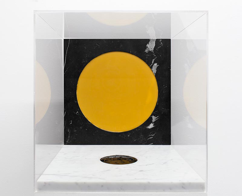 A cube of Plexiglas contains two slabs of marble—one black, the other white. In the center of each, two circles of different diameters have been hollowed out, and wax and tar have been dripped into them. This configuration creates a geometrical echo of the alchemical rule Solve et coagula: “dissolution and coagulation”, expansion and contraction; the round is born of the square just as the active is born of the passive; the yellow is born of the black just as light is born of the night.