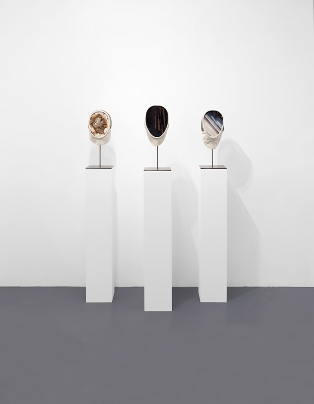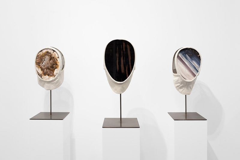 Des masques d’escrime, dont les parties grillagées protégeant la tête ont été remplacées par des coupes de pierre, choisies pour leur force évocatrice : bois pétrifié, agates, granits, améthyste. Ici, le masque ne cache rien: au contraire, il montre. Quoi ? Un morceau d’univers, une fixation de nébuleuse.