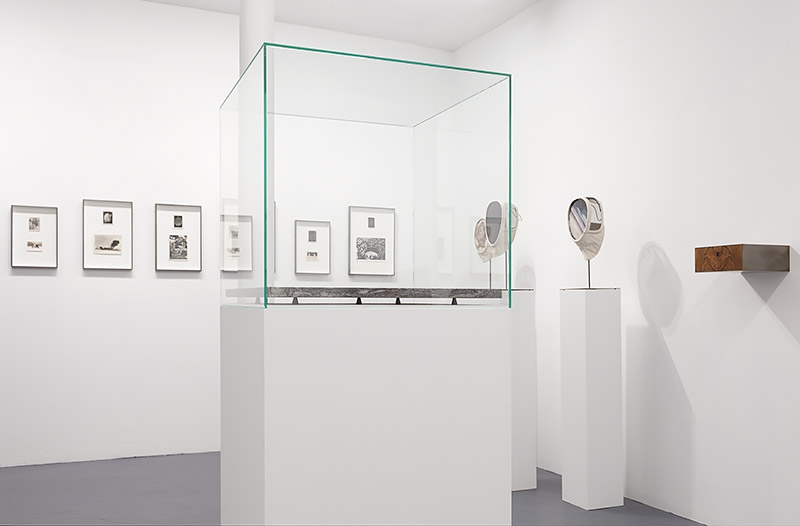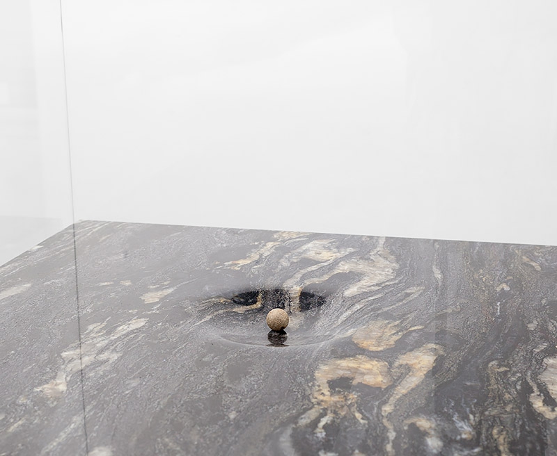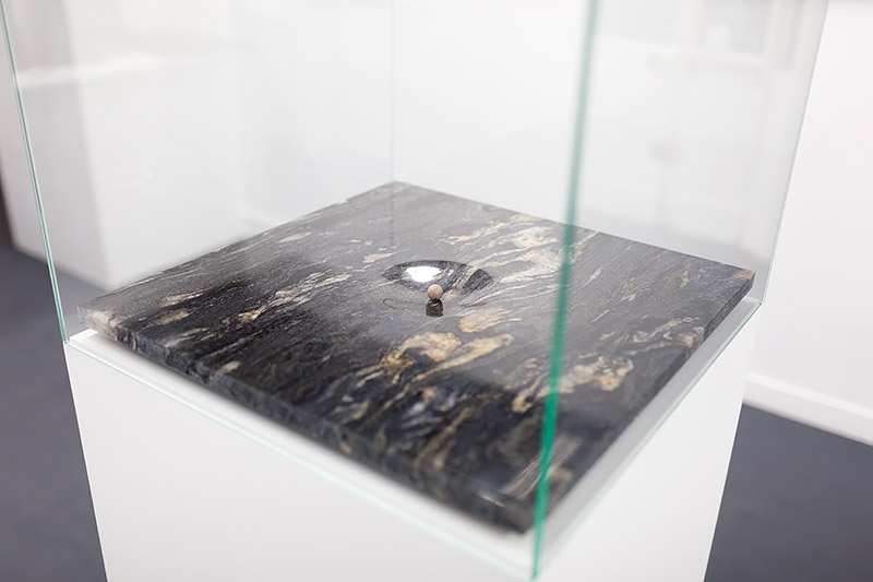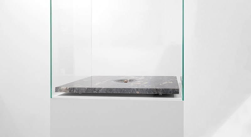 A stone ball is placed in the centre of a slab of granite. The ball was hand polished at the Neolithic period, to be placed in the mouth of a corpse to serve as a passport, as an obol, without which passage into the next world would be impossible. The granite slab, meanwhile, is a slice of a “fusing nebula (…) time surging forth in the heart of matter” (Roger Caillois,