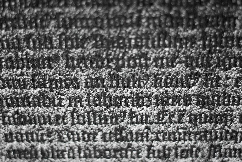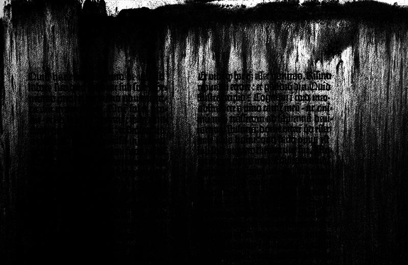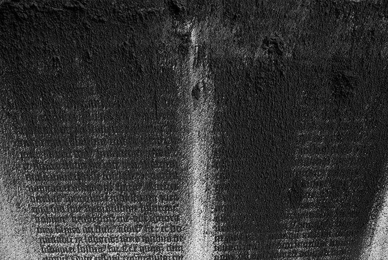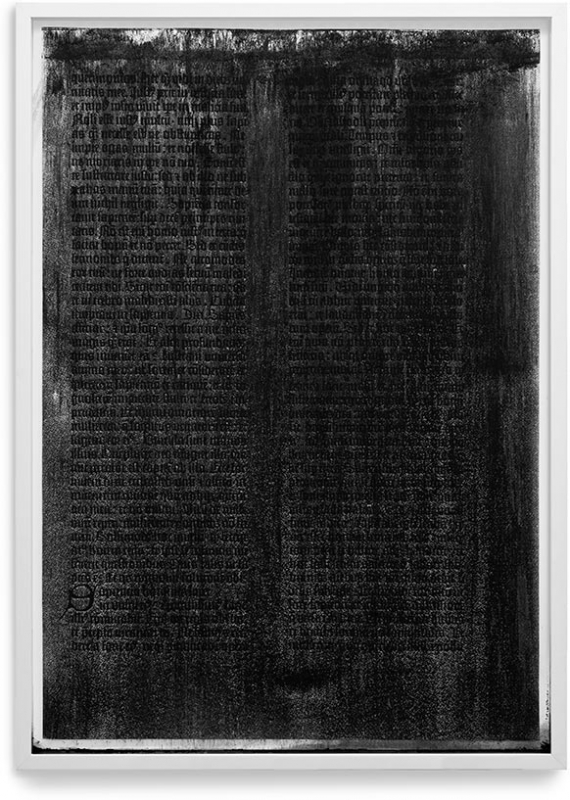 In a meditation on the passage of time and the vanity of all human endeavors, it was reproduced using charcoal powder; once fixed, the text was covered with a second, unfixed layer of the same fragile and unstable pigment, forming a more or less dense coating. Each transfer of the frame will shake some of the powder loose, letting the text reappear and gradually revealing the timelessness of its contents.