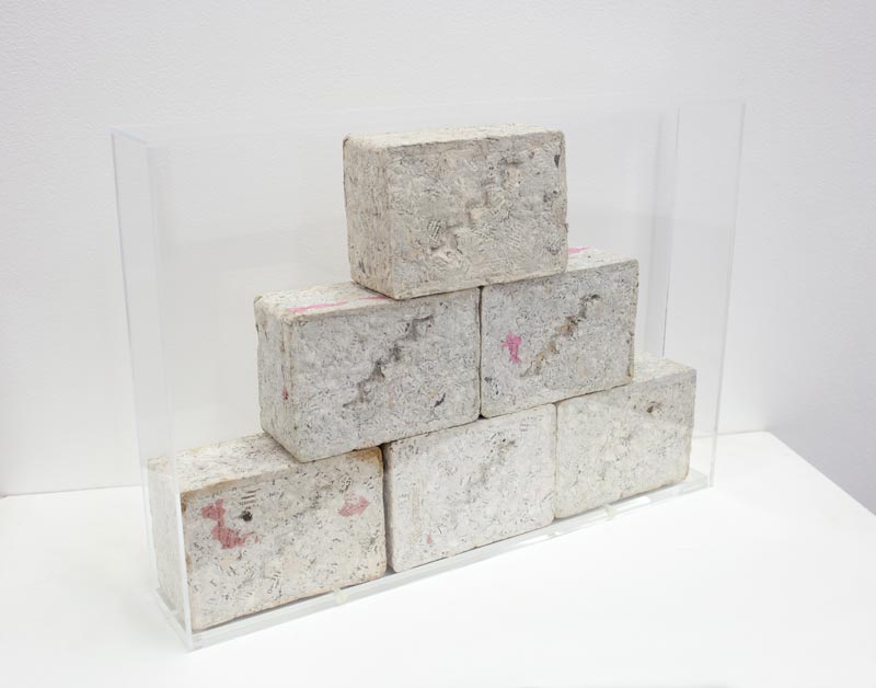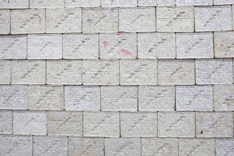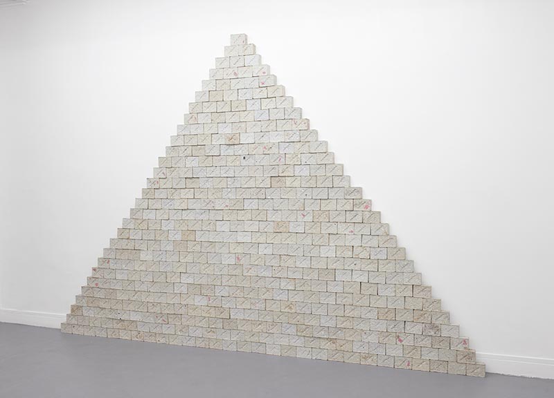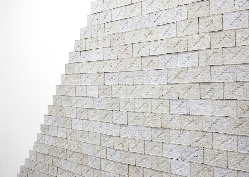 This project is an installation of varying scale, made of paper bricks made of thousands of shredded pages of French and bilingual dictionaries. The bricks are stamped with an Egyptian hieroglyph meaning “to go up”; their arrangement remains open as they are not cemented.