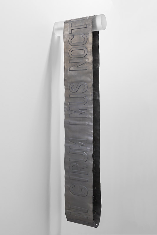 To be read backwards as well, this timeless and universal sentence remains deeply impenetrable – and poetic. Hard to translate and mysterious, it gives rise to multiple interpretations. Here is one, made with a noxious material, yet immemorial and contemporary.