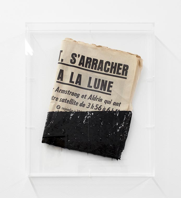 A copy of France-Soir from July 22nd, 1969, was partially drenched in tar. It was then removed, but the mark of this action has remained. A connection has been created between tar and the Moon: the power of attraction, from which one must, one day, find liberation.