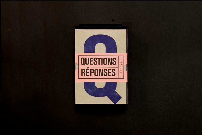 "Questions/Réponses" est une collection de 100 cartes postales en deux coffrets : 50 questions and 50 réponses cinématographiques (captures d'écran sous-titrées) tirées de films réalisés entre 1936 et 2014. Les cartes peuvent être utilisées pour créer des "dialogues postaux" avec des amis, inventer des compositions/dialogues sur un mur, ou improviser des "cadavres exquis" de répliques.