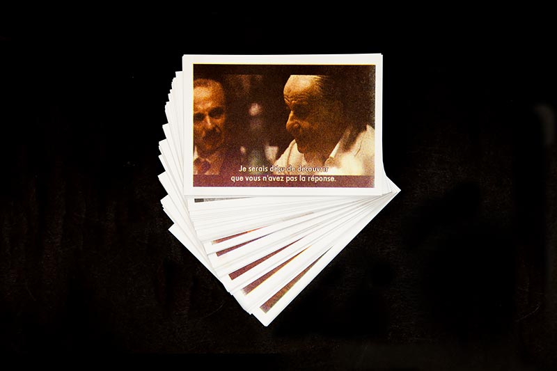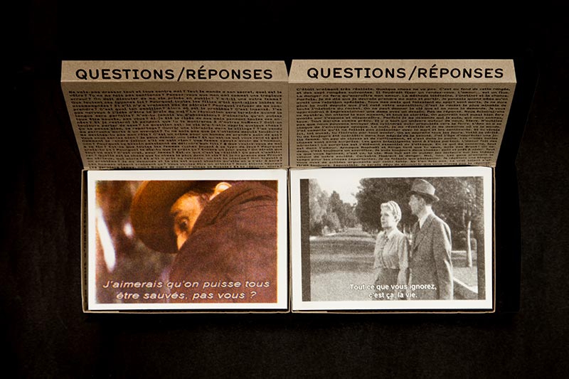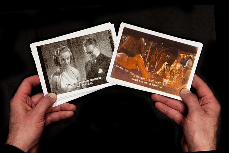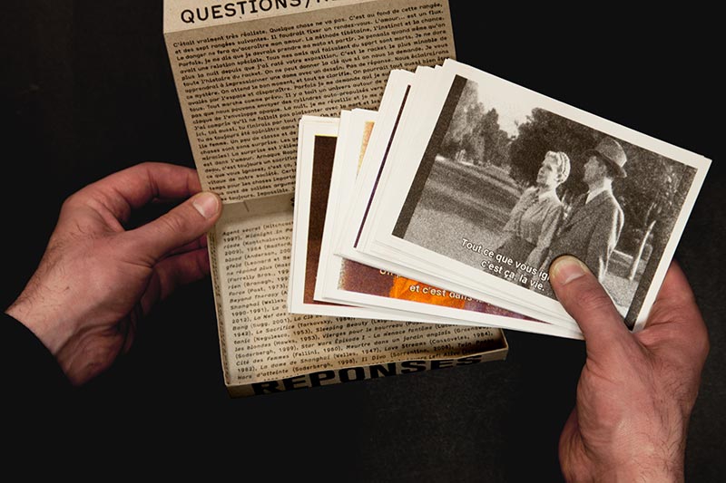 Questions/Réponses" is a collection of 100 postcards divided in two boxsets: 50 questions and 50 answers taken from movies made between 1936 and 2014 (all the images are original screenshots with subtitles). The cards can be used to create "postal dialogues" with friends, to create compositions/dialogues on a wall, or to play and improvise "cadavre exquis" of sentences.