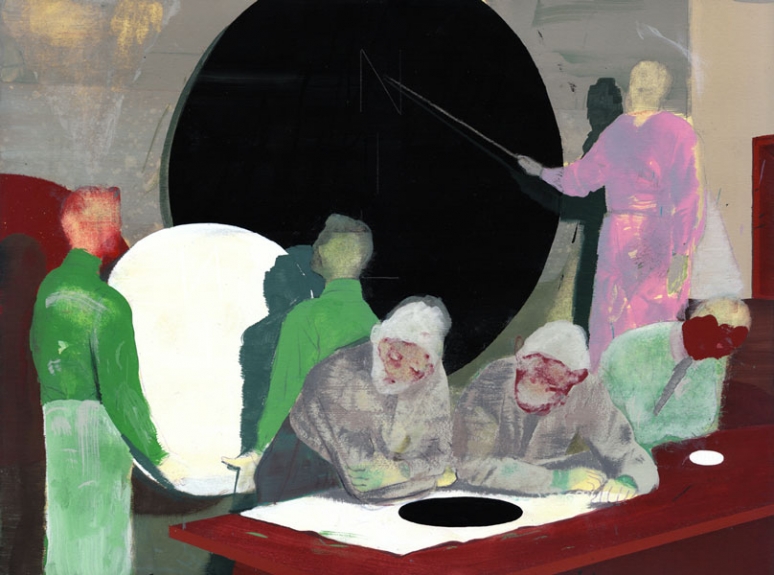 Carbon Copies,these three series arose from questions about the concept of control and, by extension, the vanity of control. The figures of the dislocated soldier, the geometry student, or the earnest scientist become actors in a theater of the absurd, fragile symbols of a vain quest for mastery of the world, asking a central question about the limits of control, and about letting go.