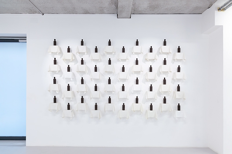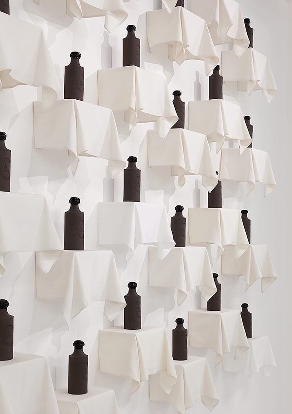 Forty black stoneware bottles are exhibited on the wall on shelves covered with cloths. Their wax-covered mouths suggest that their opening must be an intentional – and irreversible – act. Indeed, these bottles enclose a liquid – beer – whose main ingredient is anything but renewable: wheat from the 3rd century A.D. that was recovered in 1884 by Gaston Maspéro, an eminent French Egyptologist, as he excavated the necropolis of Akhmim that he had just discovered.