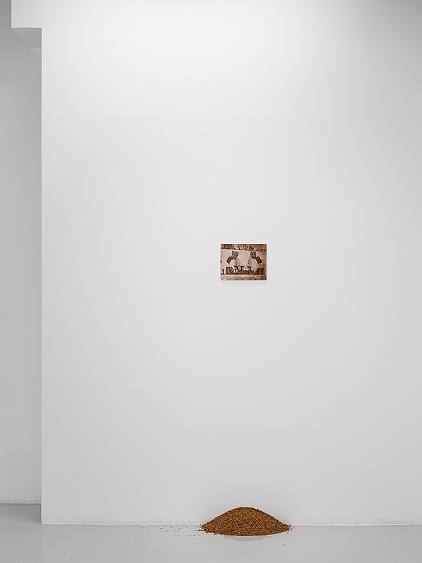 La matière première du brassage d’une bière, ou « drêche », est habituellement mise au rebut à la fin du processus. Ici, ce reliquat, mélange unique de blé antique et moderne qui a permis de réaliser la bière Ἓν τὸ πᾶν a en revanche été gardé et séché. Tel un cadeau du temps ou du rêve, il est comme tombé de l’image qui le surplombe, une photographie d’une fresque égyptienne représentant le vannage, où le blé est lançé en pluie dans l’air.