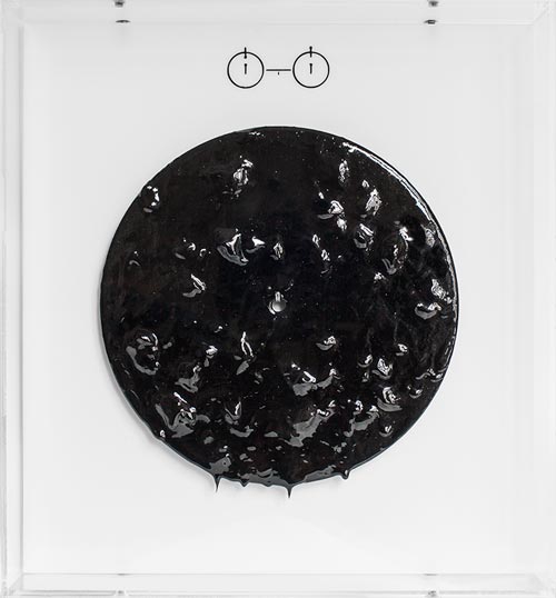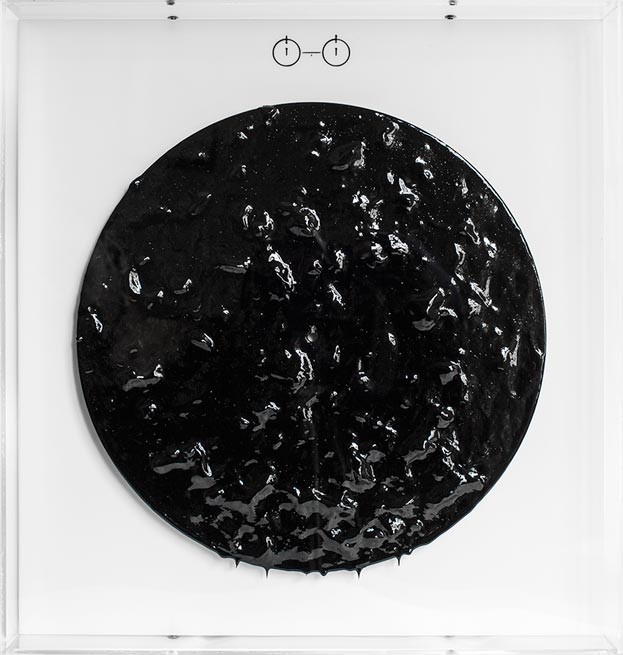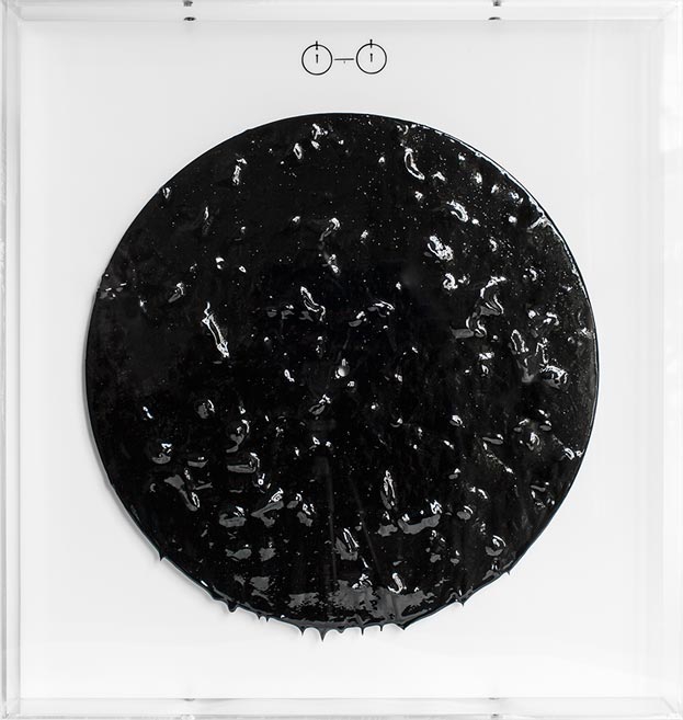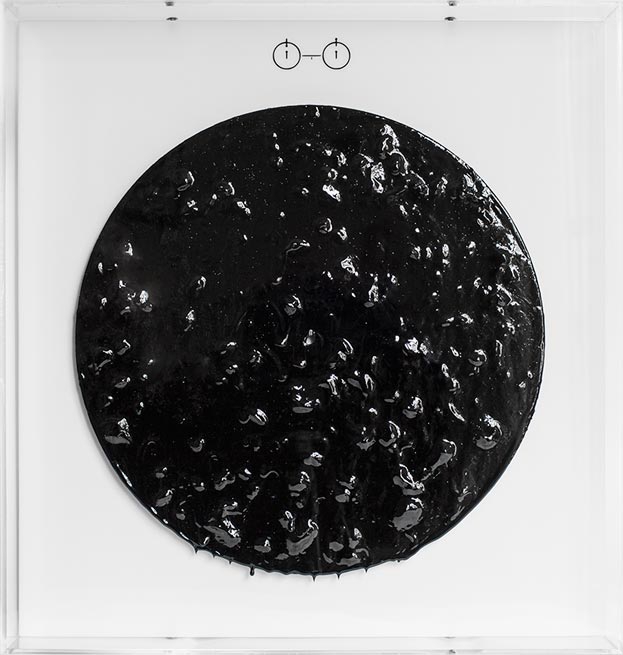 Coated with tar, these original discs become black holes or molten planets. Thanks to its properties, bitumen can perfectly preserve the music, yet preventing its immediate playback. It is a potential, silent music which emerges from this piece.