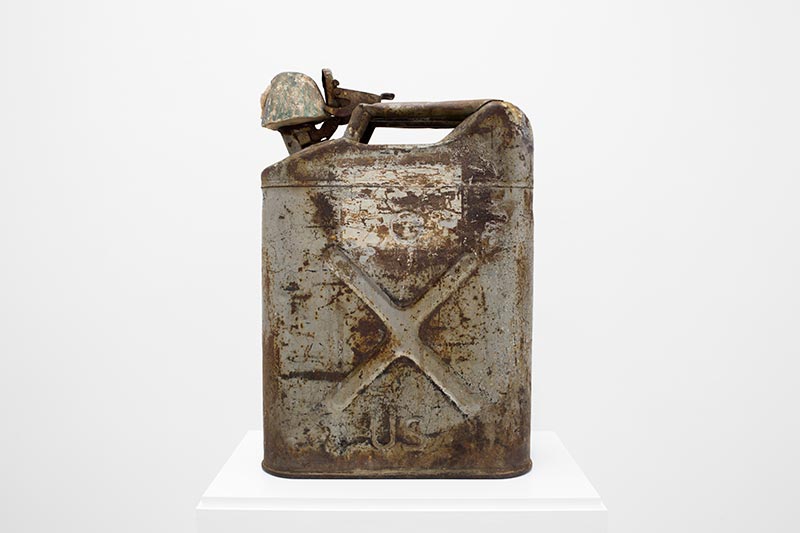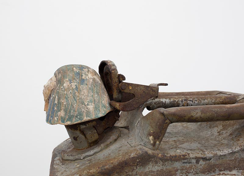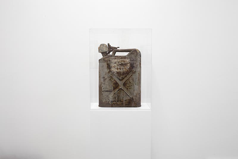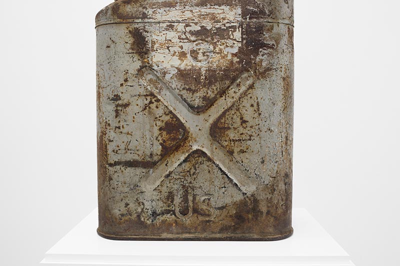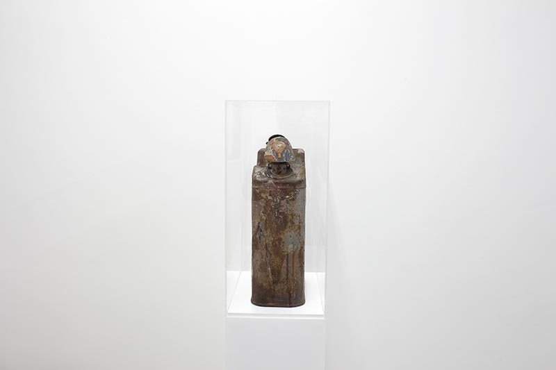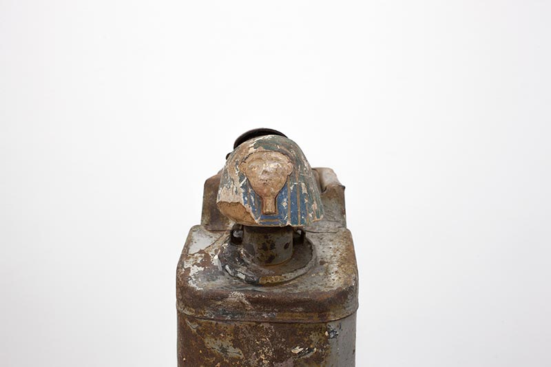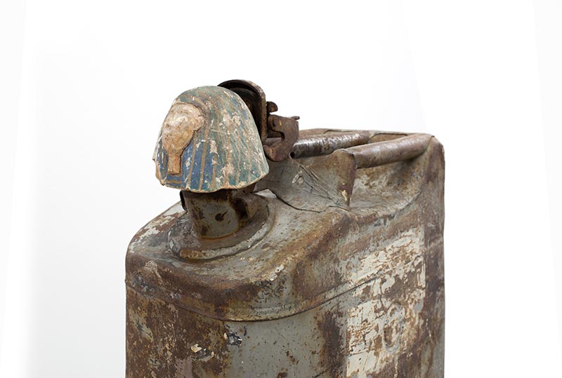 Two civilisations are joined together around petroleum, an essential substance in both societies (tar was a vital material used for embalming); this new Sphinx brings two objects back to life by placing them in a new context, one in which a jerrycan becomes an archeological relic and a lid finds its original function once again. Jerrican US WWII, antique canopic lid, plexiglas see alsoOushebti
