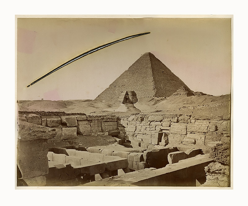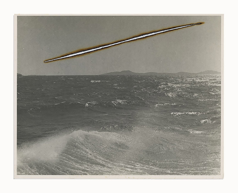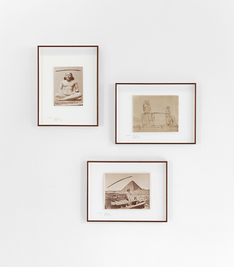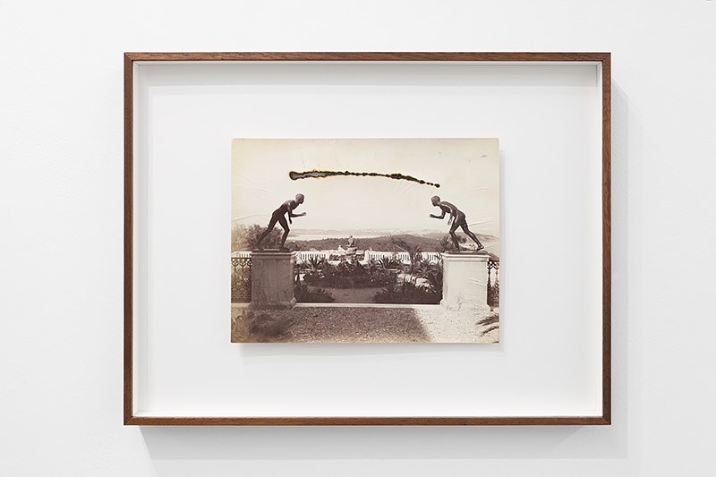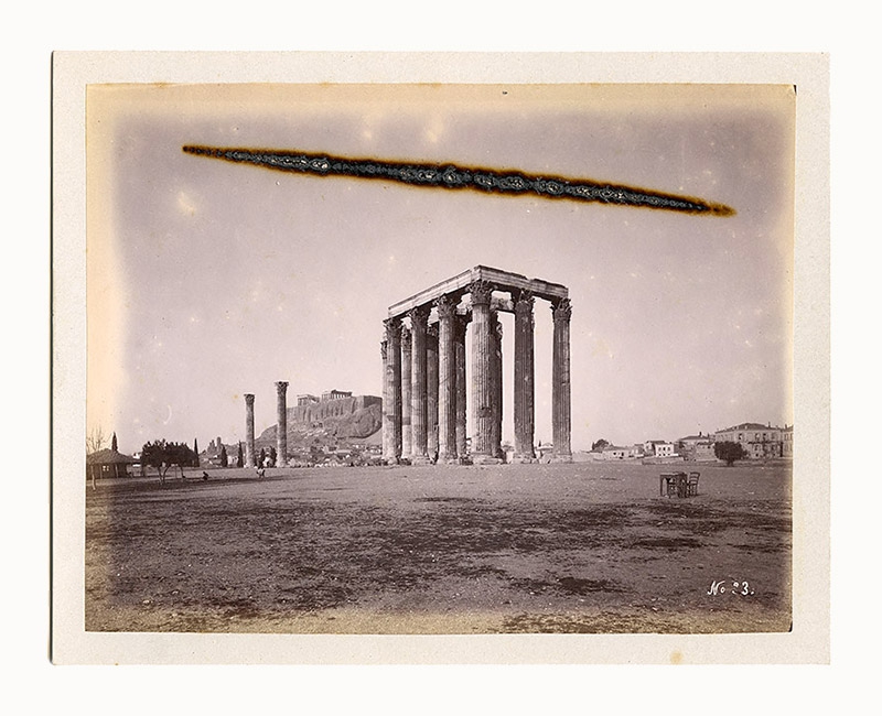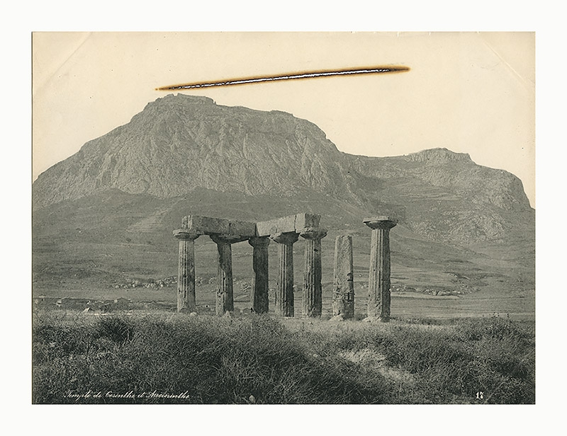 Des tirages photographiques de la fin du XIXe siècle reproduisant des vestiges antiques ou des paysages naturels sont striés d’une ligne carbonisée.