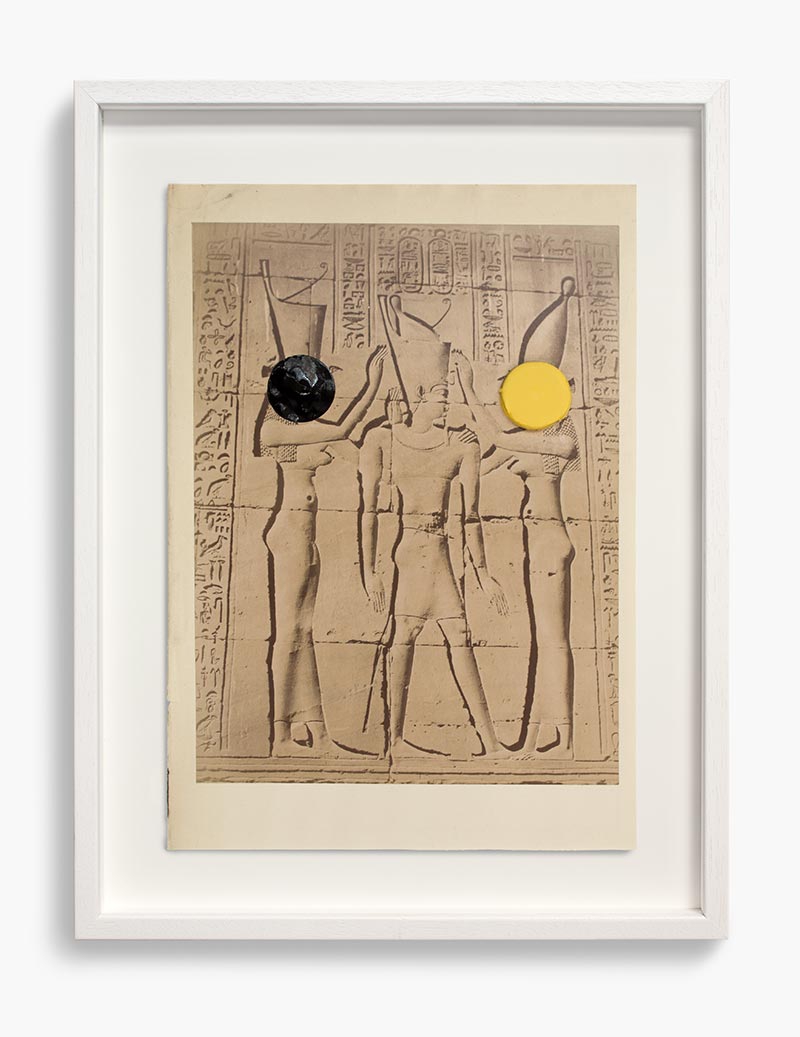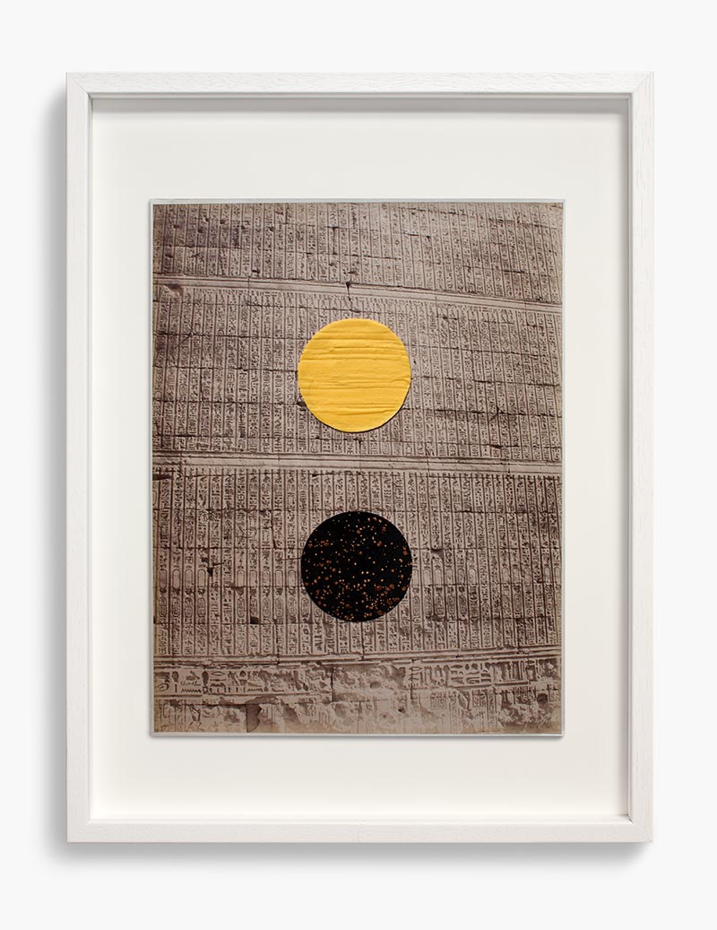 Ces photographies d’Egypte, de Grèce, d’Italie (certaines anonymes, la plupart signées) sont typiques de la période: sites archéologiques, objets et statues des musées côtoient des scènes de genre de la vie quotidienne. Plusieurs temporalités se superposent: les temps antiques, le moment où la photo a été prise, et l’instant présent. Mais c’est un présent intemporel qui est ici appelé; les ronds de bitume et de cire matérialisent une énergie invisible et éternelle, celle du mouvement binaire, à la fois rythme et transformation, yin/yang.