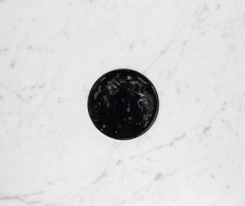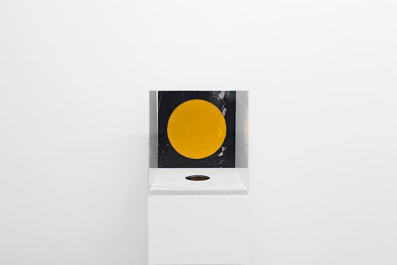 A cube of Plexiglas contains two slabs of marble—one black, the other white. In the center of each, two circles of different diameters have been hollowed out, and wax and tar have been dripped into them. This configuration creates a geometrical echo of the alchemical rule Solve et coagula: “dissolution and coagulation”, expansion and contraction; the round is born of the square just as the active is born of the passive; the yellow is born of the black just as light is born of the night.