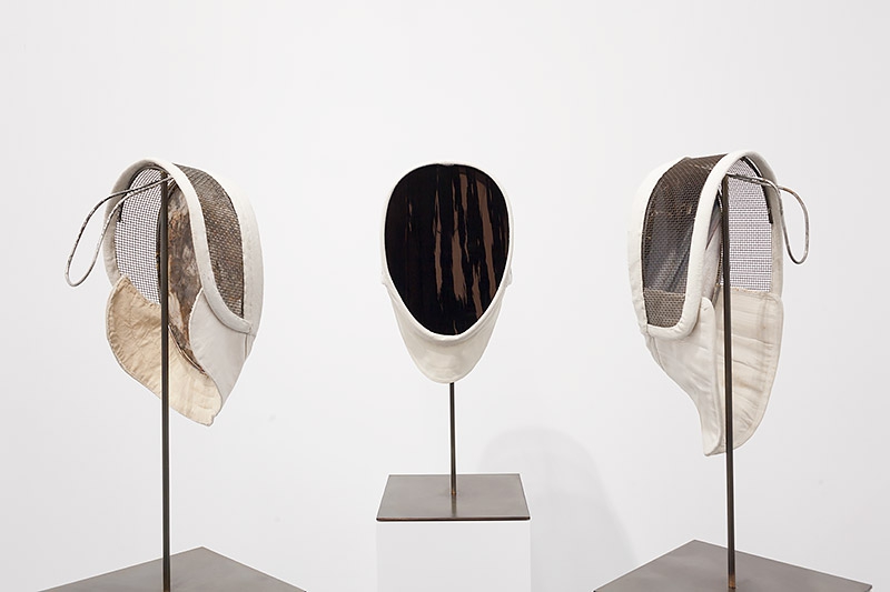 Three masks, with ‘faces’ in stone. These are old fencing masks, with the section that covers (and protects) the face removed. Where they once hid, they now reveal – what, exactly? A fragment of the universe, a nebula fixed in space, a dive into material in which the macro meets the micro. We are confronted with an “unsuspected eternal face” (J. L. Borges,