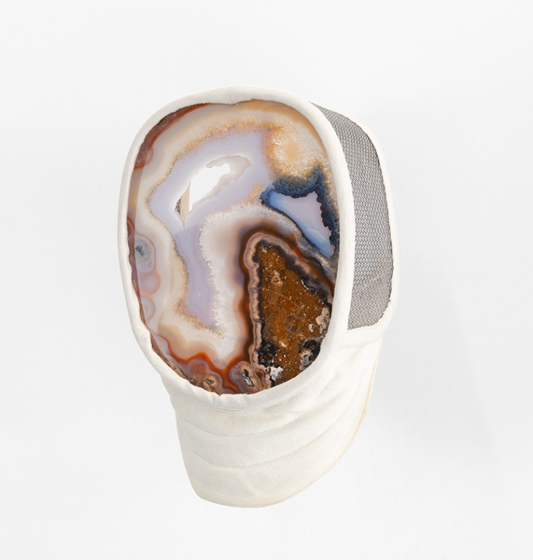 Des masques d’escrime, dont les parties grillagées protégeant la tête ont été remplacées par des coupes de pierre, choisies pour leur force évocatrice : bois pétrifié, agates, granits, améthyste. Ici, le masque ne cache rien: au contraire, il montre. Quoi ? Un morceau d’univers, une fixation de nébuleuse.