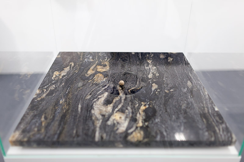 A stone ball is placed in the centre of a slab of granite. The ball was hand polished at the Neolithic period, to be placed in the mouth of a corpse to serve as a passport, as an obol, without which passage into the next world would be impossible. The granite slab, meanwhile, is a slice of a “fusing nebula (…) time surging forth in the heart of matter” (Roger Caillois,
