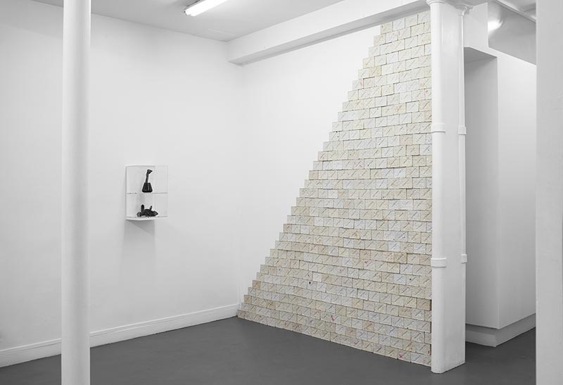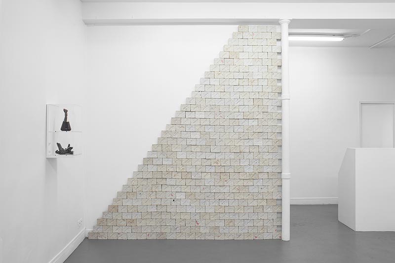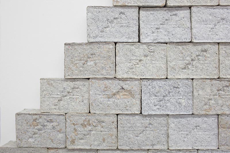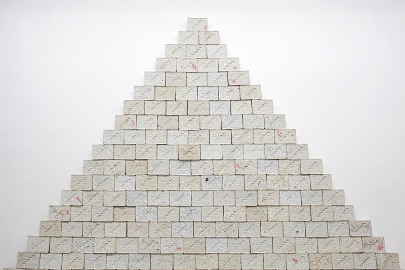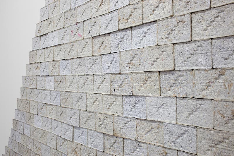 This project is an installation of varying scale, made of paper bricks made of thousands of shredded pages of French and bilingual dictionaries. The bricks are stamped with an Egyptian hieroglyph meaning “to go up”; their arrangement remains open as they are not cemented.