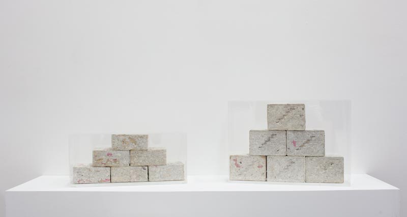 Aucun ciment n’étant utilisé, la disposition des briques reste ouverte: le type d’architecture choisie (escalier, pyramide, mur…) met ainsi en lumière le potentiel symbolique de la brique, a fortiori d’une brique de mots.