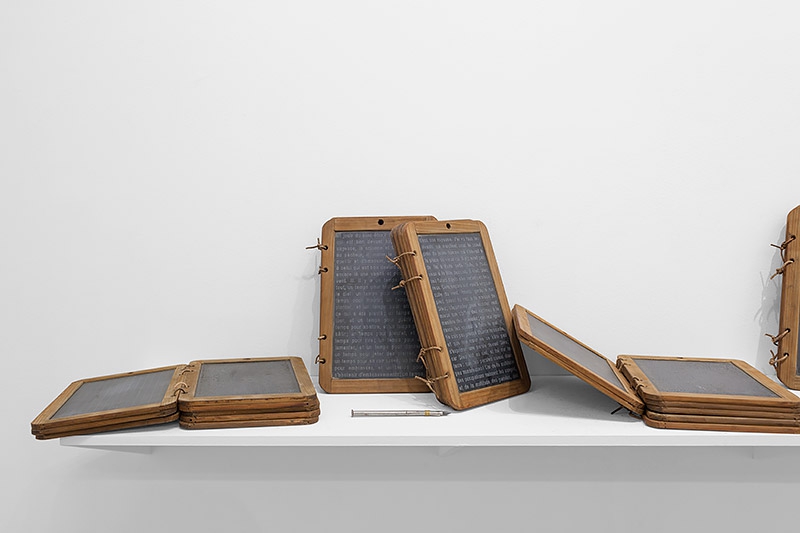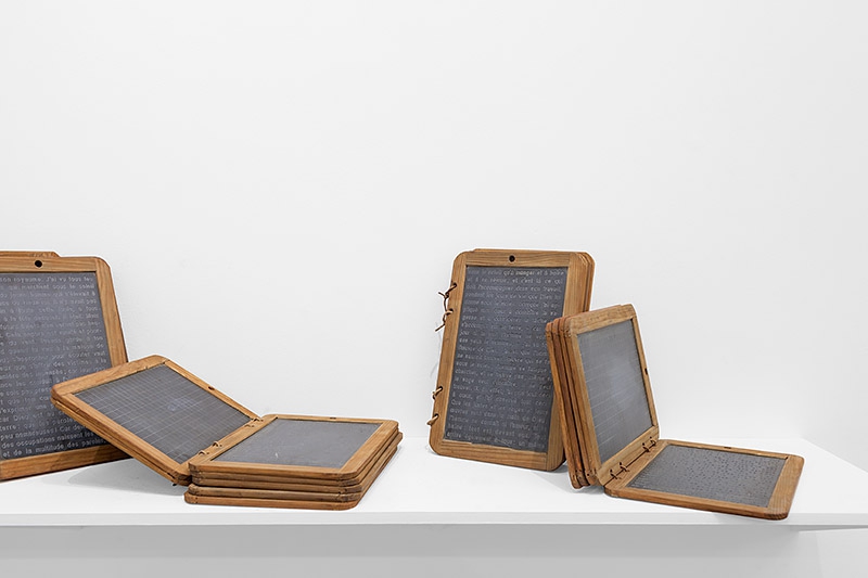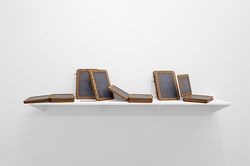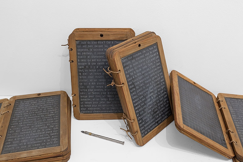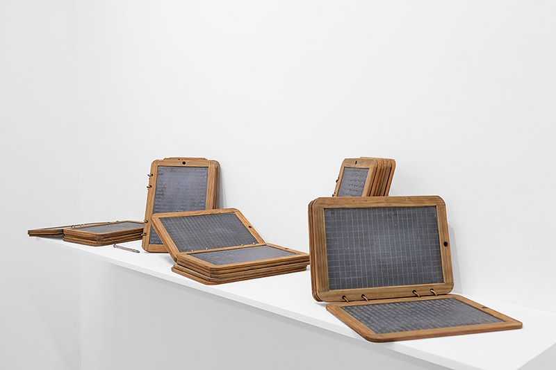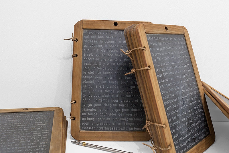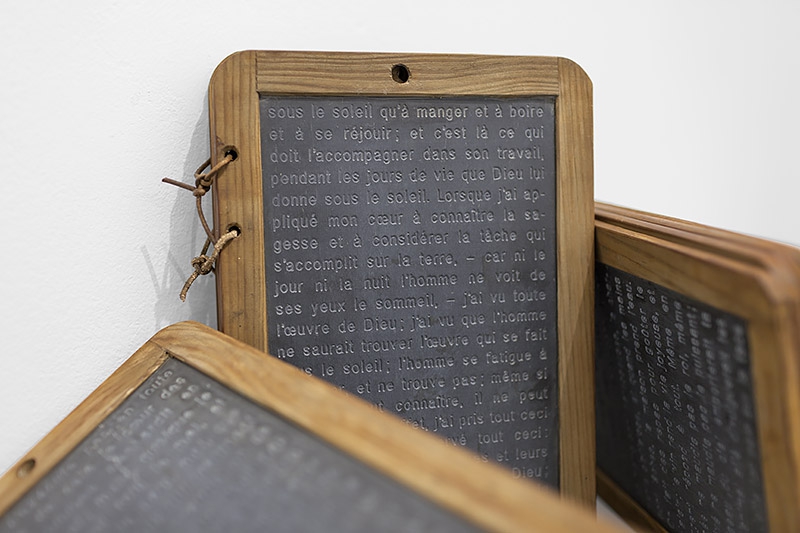 A stable material support where writing can be eternally preserved has yet to be found: clay, parchment, papyrus, paper, plastic and electronic data all share the same shortcoming. Stone is technically the strongest support – it can be broken, but inscriptions are hard to erase – although it is perhaps the least practical. With the notion of learning at the heart of this project, one material seemed particularly apt for its realization: slate. It is no coincidence that modern digital tablets have, by and large, the same dimensions as a school slate: this project is both human in scale and much vaster by virtue of its boundless encyclopaedic ambition. It raises the question of the eternal protection of knowledge in the face of the accepted notion that “all is vanity and striving after wind” (